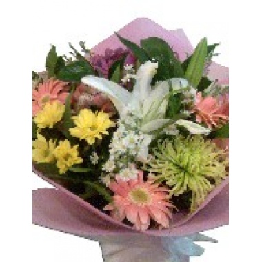 Consist of liliums, gerbera and mums wrapped elegantly with fillers and ferns